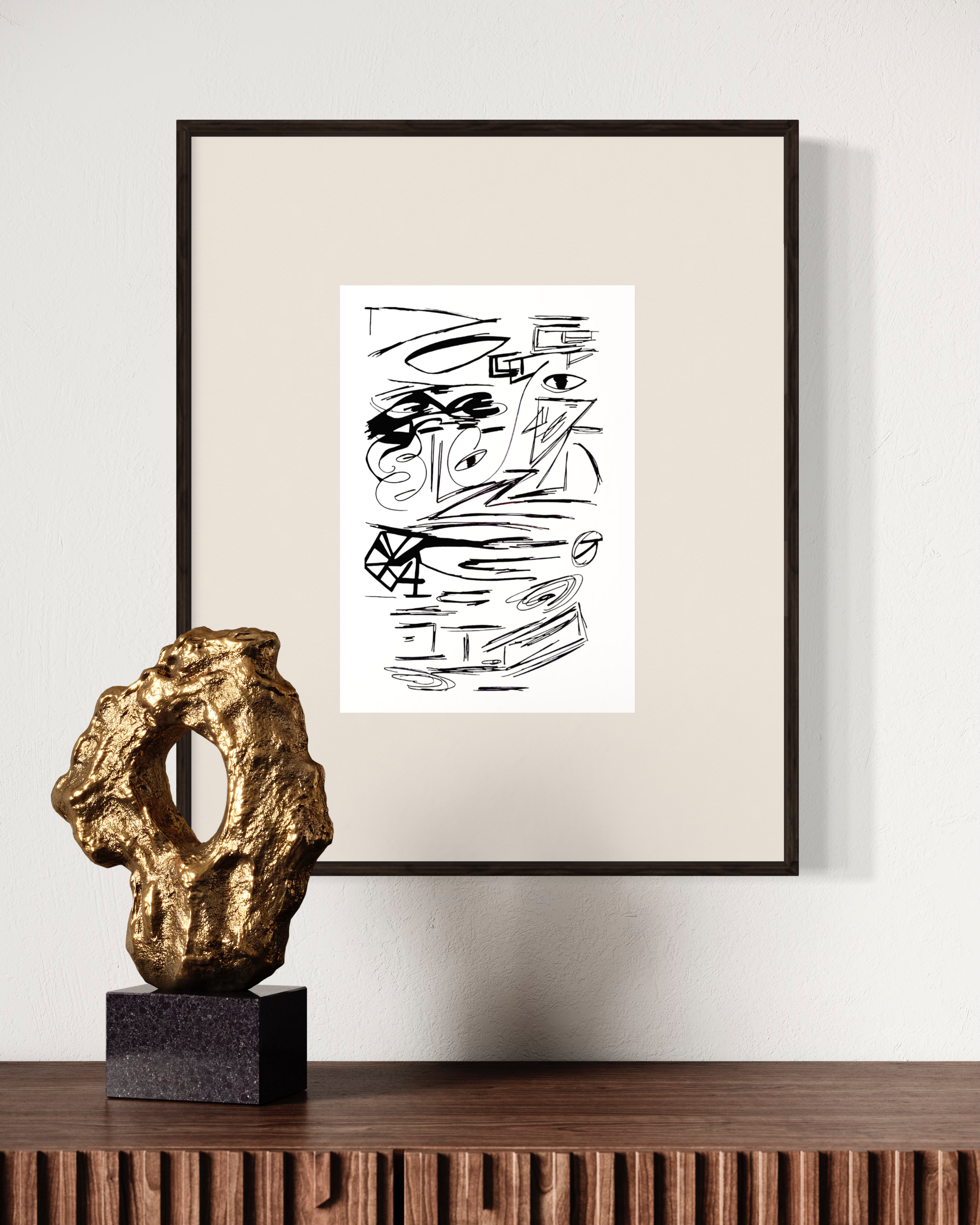 Avec Griot, SEYMR® transpose le rôle du conteur traditionnel dans une œuvre graphique. Chaque signe agit comme une parole silencieuse, un fragment de récit ancestral inscrit dans la trame du papier.